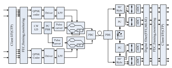 PM-QPSK(Polarization-multiplexed Quadrature Phase Shift Keying,偏振復(fù)用正交相移鍵控)的信號(hào)在接收側(cè)采用相干檢測(cè)技術(shù)可以實(shí)現(xiàn)高性能的信號(hào)解調(diào),和直接解調(diào)、差分解調(diào)方式相比,相干檢測(cè)所使用的本地激光器的功率要遠(yuǎn)大于輸入光信號(hào)的光功率,所以光信噪比可以極大地改善[1]。特別是相干檢測(cè)技術(shù)充分利用強(qiáng)大的DSP(Digital Signal Processing,數(shù)字信號(hào)處理)技術(shù)來(lái)處理極化模復(fù)用信號(hào),可以通過(guò)后續(xù)的數(shù)字信號(hào)處理補(bǔ)償并進(jìn)行信號(hào)重構(gòu),可以還原被傳輸?shù)男盘?hào)的特性(極化模、幅度、相位),大幅度消除光纖帶來(lái)的傳輸損傷,如PMD(Polarization Mode Dispersion,偏振模色散)容忍度達(dá)30ps,無(wú)需線路色散補(bǔ)償就可以容忍幾萬(wàn)ps/nm,相比與其他的100G傳輸方案,如非相干PM-DQPSK或OFDM(Orthogonal Frequency Division Multiplexing,正交頻分復(fù)用技術(shù)),PM-QPSK結(jié)合相干檢測(cè)提供了最優(yōu)化的解決方案,這被大多數(shù)的系統(tǒng)供應(yīng)商選擇為100G傳輸方案。