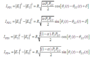 信號(hào)光和本地振蕩源的TE、TM模光信號(hào),分別進(jìn)入對(duì)應(yīng)的90°混頻器,所得到的檢測(cè)信號(hào)分別為: