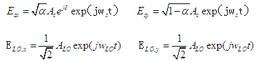 其中Esx,Esy,ELO.x,ELO.y分別表示信號(hào)光和本地振蕩源的TE、TM模式的光信號(hào),α表示信號(hào)光TE模所占比例,δ表示初始相位,ws表示信號(hào)光角頻率,As表示信號(hào)光的振幅。