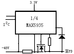 圖5為簡化的PSE電源控制示意圖,控制芯片為MAX5935,其特點(diǎn)為:四個(gè)獨(dú)立-48V PoE端口;可提供的工作模式包括自動(dòng)、半自動(dòng)、手動(dòng)、關(guān)斷和調(diào)試模式。自動(dòng)模式允許器件在無需軟件干預(yù)的情況下工作。半自動(dòng)模式(按需)連續(xù)檢測并分級(jí)連接到端口上的設(shè)備,但在接到軟件指令前不會(huì)給端口加電。手動(dòng)模式允許軟件完全控制器件,對于系統(tǒng)診斷非常有用。關(guān)斷模式終止所有活動(dòng),并關(guān)閉端口上的電源。最后,調(diào)試模式允許精細(xì)地步進(jìn)器件狀態(tài)機(jī),以便進(jìn)行細(xì)致的系統(tǒng)診斷。