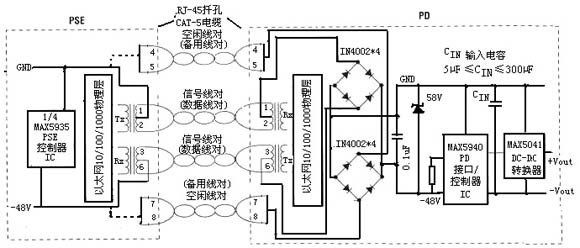 PSE控加制器應(yīng)用實(shí)例見圖4所示, 是用MAX5935 PSE控制器和MAX5940 PD接口/控制器的PoE供電糸統(tǒng)簡化設(shè)計(jì)方框圖.它給出了千兆位以太網(wǎng)中PSE 和PD的連接。由于千兆位以太網(wǎng)不支持中間電源注入,100/10M以太網(wǎng)模式只能連接到一個(gè)端點(diǎn)PSE交換機(jī)上,MAX5940 PD接口控制器根據(jù)需要也可以加一個(gè)或二個(gè)。PD還需DC-DC 轉(zhuǎn)換器以輸出+Vout -Vout.