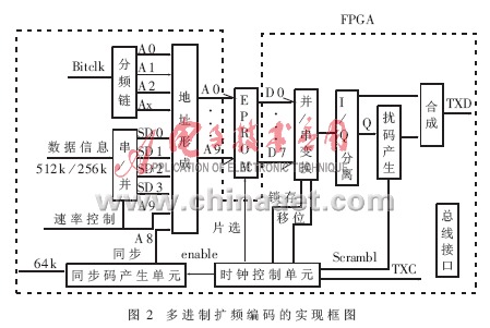 圖2示出多進(jìn)制擴(kuò)頻編碼的實(shí)現(xiàn)原理。其中,分頻鏈形成低位地址、EPROM的片選線、并/串變換的鎖存信號(hào)和移位信號(hào)以及其他時(shí)鐘源。串/并變換輸出形成信息地址。地址形成單元主要是控制兩種速率下的地址選擇,選取不同的擴(kuò)頻碼。當(dāng)速度為低速時(shí),A3=Ax,而Sd0~Sd3對(duì)應(yīng)為A4~A7;當(dāng)速度為高速時(shí),A3=Sd0,而A7=Ax,用來(lái)做奇偶定位,Sd0~Sd3對(duì)應(yīng)為A3~A6。同步碼產(chǎn)生單元輸出同步支路的同步序列,依次為32位0、1碼和48位巴克碼。時(shí)鐘控制單元產(chǎn)生巴克碼和擾碼使能信號(hào),并在同步碼發(fā)完時(shí)刻給終端送出時(shí)鐘信號(hào)TXC。從圖中可以看出,采用查表法很方便地實(shí)現(xiàn)了正交擴(kuò)頻編碼,用一些時(shí)序組合電路替代了復(fù)雜的乘法器。