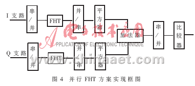 圖3中的多進(jìn)制解擴(kuò)單元是接收機(jī)的核心單元,完成了最佳非相干運(yùn)算的核心部分。運(yùn)算量大,用軟件方法很難實(shí)現(xiàn)。經(jīng)評(píng)估我們發(fā)現(xiàn),采用AD公司最新的DSP器件ADSP21062也只能實(shí)現(xiàn)其運(yùn)算量的1/3左右。我們用一片ALTERA公司的FLEX10K100實(shí)現(xiàn)了并行相關(guān)解擴(kuò)算法實(shí)現(xiàn)的三種方案:串行FHT法、并行FHT法、并行積分法。圖4是并行FHT方案的實(shí)現(xiàn)原理圖。經(jīng)統(tǒng)計(jì)內(nèi)部邏輯資源約占用70%,I/O腳占用10%左右,布線資源占用60%左右。