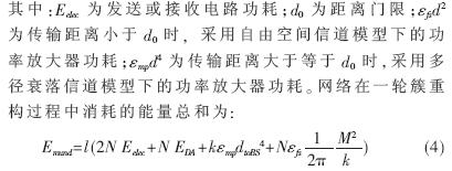 傳感器節(jié)點(diǎn)的能量主要消耗在無(wú)線傳輸?shù)倪^(guò)程中,而且隨著通信距離的增加,節(jié)點(diǎn)能耗呈指數(shù)增長(zhǎng)。發(fā)送和接收1 bit數(shù)據(jù)且傳輸距離為d,節(jié)點(diǎn)消耗的能量分別為: