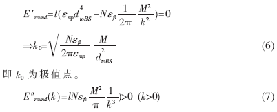 通過(guò)選舉產(chǎn)生的最優(yōu)簇頭節(jié)點(diǎn)數(shù),應(yīng)使網(wǎng)絡(luò)在每一輪的簇重構(gòu)中消耗能量最小[3],即使式(4)中Eround達(dá)到極小值的k值點(diǎn)。由(4)式可知,在其他網(wǎng)絡(luò)參數(shù)設(shè)定的前提下,當(dāng)k>0時(shí)Eround是關(guān)于k的連續(xù)函數(shù)。