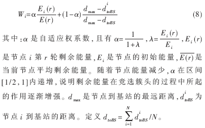 本文在簇頭選舉時(shí)綜合考慮能量和距離兩個(gè)因素,為每個(gè)節(jié)點(diǎn)分配一個(gè)權(quán)值表示其適合充當(dāng)簇頭的程度。某個(gè)節(jié)點(diǎn)i在第r輪簇頭選舉中的競(jìng)選權(quán)值為: