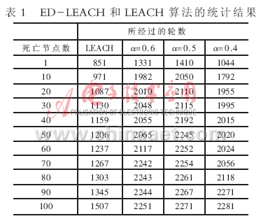 對(duì)(9)式中權(quán)重因子α=0.6、0.5、0.4時(shí)ED-LEACH和LEACH算法比較結(jié)果如表1所示。