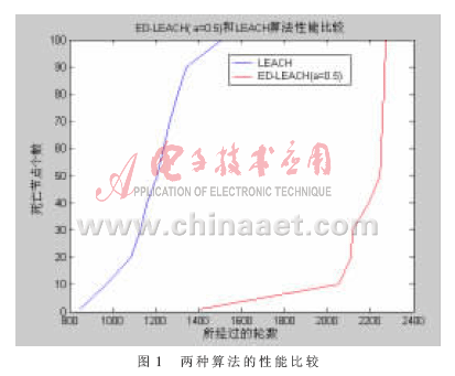 由表1可得,ED-LEACH算法不論取0.6、0.5、還是0.4時(shí),第一個(gè)節(jié)點(diǎn)、一半節(jié)點(diǎn)、全部節(jié)點(diǎn)死亡所經(jīng)過(guò)的輪數(shù)均比LEACH算法多。當(dāng)α=0.5時(shí)算法的性能最優(yōu),第一個(gè)節(jié)點(diǎn)、一半節(jié)點(diǎn)、全部節(jié)點(diǎn)死亡輪數(shù)分別延長(zhǎng)了65.69%、86.15%、50.70%。將ED-LEACH算法(α=0.5)和LEACH算法利用matlab比較結(jié)果如圖1所示。