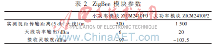 倉庫的面積大小不一,有的甚至可以達(dá)到1 000 m2,對硬件的傳輸距離要求比較苛刻。如表1所列的計算表,已經(jīng)是ZICM2410模塊工作在最大通信范圍時的功耗,在此功耗下,外置5 dBi的天線,可實現(xiàn)視距500 m的通信,使用板載天線,寫字樓內(nèi)通信距離可達(dá)到150 m,基站如果采用有線供電,可以使用大功率高接收靈敏度模塊(ZICM2410P2),實現(xiàn)視距1 500 m的通信距離。ZigBee模塊參數(shù)如表2所示。