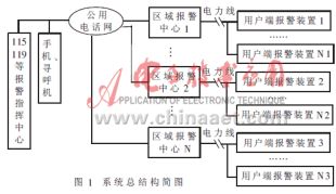 該系統(tǒng)根據(jù)變壓器供電范圍劃分區(qū),單個(gè)變壓器為一個(gè)區(qū)。在單個(gè)區(qū)內(nèi),用戶(hù)與區(qū)域中心之間采用電力線載波通訊,其直接經(jīng)濟(jì)的優(yōu)點(diǎn)和巡檢用戶(hù)的功能是現(xiàn)有電話報(bào)警系統(tǒng)所不具備的;各區(qū)與報(bào)警指揮中心和用戶(hù)手機(jī)、尋呼機(jī)之間采用公用電話網(wǎng)通訊,充分利用電話報(bào)警遠(yuǎn)距離傳輸?shù)膬?yōu)勢(shì),回避了電力線載波方式受供電范圍及距離限制的弊病。