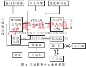 電路框圖如圖2所示。中心設(shè)備采用AT89C51單片機(jī)為主控單元,通過(guò)LM1893芯片實(shí)現(xiàn)與各用戶(hù)端通訊,傳輸報(bào)警和巡檢信息。另一端由MT8888芯片通過(guò)電話網(wǎng)將報(bào)警信息迅速傳至報(bào)警指揮中心及個(gè)人手機(jī)、尋呼機(jī)上。