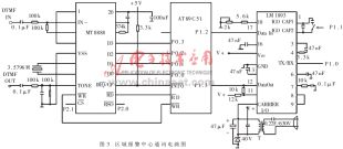 MT8888是一種完整的高性能DTMF收發(fā)器,不僅能收發(fā)DTMF信號(hào),實(shí)現(xiàn)自動(dòng)撥號(hào),還可選擇呼叫過(guò)程濾波器以檢測(cè)電話干線上的回鈴音、撥號(hào)音、忙音等信號(hào)音,適合與單片機(jī)接口,且外圍邏輯電路簡(jiǎn)單。MT8888芯片IRQ/CP端與AT89C51的INT0連接,通過(guò)INT0向單片機(jī)發(fā)出申請(qǐng)。圖3為區(qū)域報(bào)警中心通訊電路圖。