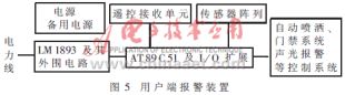 圖5為用戶(hù)端硬件框圖。用戶(hù)端裝置以單片機(jī)AT89C51為核心,輔以門(mén)窗開(kāi)關(guān)、玻璃破碎、溫度、煤氣、煙霧及運(yùn)動(dòng)人體檢測(cè)傳感器陣列。一旦檢測(cè)到警情,通過(guò)LM1893專(zhuān)用電力線載波通信芯片傳輸數(shù)據(jù),控制自動(dòng)噴灑、門(mén)禁開(kāi)關(guān)、聲光報(bào)警、繼電器(如電源開(kāi)關(guān))、攝像機(jī)及監(jiān)聽(tīng)探頭等報(bào)警控制陣列;用戶(hù)端通過(guò)LM1893的收發(fā)數(shù)據(jù)來(lái)接受和響應(yīng)區(qū)域中心發(fā)來(lái)的巡檢命令。