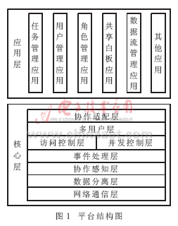 應用層和核心層的合作是通過事件流連接在一起的。以流入事件流為例說明:首先由網絡通信層接收事件,由數(shù)據分離層負責數(shù)據的處理,然后由協(xié)作感知層確定正確的操作目標;事件處理層在調度訪問控制和并發(fā)控制檢測之后執(zhí)行相應操作。這里值得注意的是:操作是由事件處理層負責調度并執(zhí)行的,但其內容是由應用層提供的。