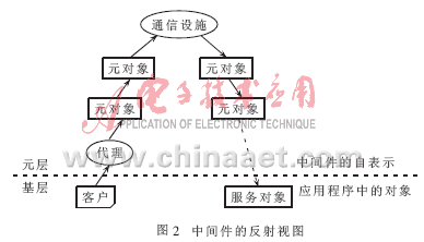 每一次反射計算可以被分為二個邏輯部分:計算流上下文切換和元行為。計算從基層的計算流開始,當基層實體執(zhí)行某個行為時,該行為被元實體捕獲,同時計算流上升到元層(稱之為換上操作),然后元實體執(zhí)行其元計算。當允許基層實體執(zhí)行時,計算流又返回到基層(稱之為換下操作)。中間件的反射視圖如圖2所示[4]。