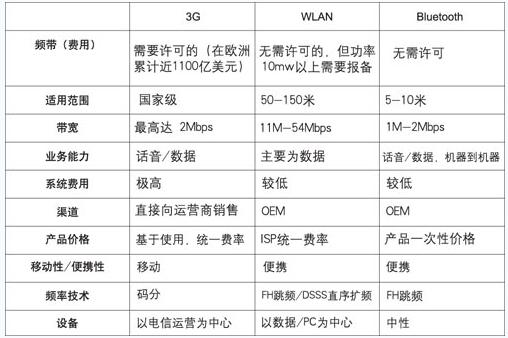 3G、WLAN、Bluetooth這三種技術(shù)本質(zhì)上是互補(bǔ)性的,盡管它們可能在邊緣上是競爭的。