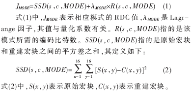H.264協(xié)議采用Lagrange代價(jià)函數(shù)計(jì)算每種模式下宏塊的RDC值,其定義如下: