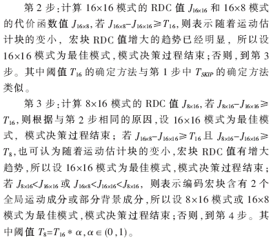 第1步:計(jì)算編碼宏塊SKIP模式的RDC值JSKIP并與閾值TSKIP比較,若小于閾值則表示SKIP模式為最佳模式,模式?jīng)Q策過(guò)程結(jié)束;否則,到第2步。其中閾值TSKIP的確定方法是根據(jù)經(jīng)驗(yàn)確定一個(gè)比較小的初值,在編碼過(guò)程中利用所有用SKIP模式編碼的已編碼宏塊的RDC值的均值動(dòng)態(tài)改變它。