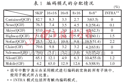 使用H.264參考軟件JM9.3對(duì)9個(gè)QCIF和CIF格式的圖像序列進(jìn)行編碼實(shí)驗(yàn),編碼模式的分配情況如表1所示。從表中可以得到很多關(guān)于圖像統(tǒng)計(jì)特性的信息:(1)SKIP模式被使用的概率相當(dāng)高,特別是那些類(lèi)似于視頻通信應(yīng)用的圖像序列,如Claire、News等序列。這表明對(duì)這些圖像進(jìn)行編碼時(shí)如果能夠盡早確定是否采用SKIP模式,將使模式?jīng)Q策過(guò)程所需的時(shí)間大大減少。(2)P幀中的宏塊使用幀內(nèi)預(yù)測(cè)編碼模式(表中INTRA列)的概率很低,所以對(duì)P幀中的宏塊不采用幀內(nèi)模式對(duì)編碼質(zhì)量不會(huì)產(chǎn)生大的影響。(3)對(duì)于8×8的子塊采用8×4、4×8、4×4 3種子模式的概率較低,特別是在那些類(lèi)似于視頻通信應(yīng)用的序列中,這3種子模式被使用的概率只有1%左右,而含有許多運(yùn)動(dòng)成分的圖像序列使用這3種子模式的概率大約是2%~10%。由于算法主要針對(duì)小尺寸視頻圖像在移動(dòng)終端設(shè)備中的應(yīng)用,為了大幅度降低算法復(fù)雜度可以去掉這3種子模式。