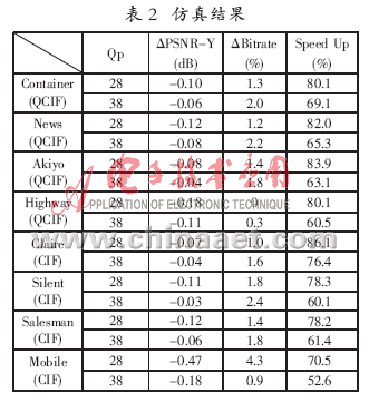 根據(jù)本文提出的方法,修改軟件JM9.3的相應(yīng)部分,并對(duì)8個(gè)格式為CIF和QCIF的圖像序列進(jìn)行了編碼仿真。具體的仿真環(huán)境:編碼幀數(shù)為100,參考幀數(shù)為5,序列形式為IPPP,固定的量化系數(shù)(28、38),CAVLC熵編碼。此外,采用JM軟件默認(rèn)的運(yùn)動(dòng)估計(jì)算法,搜索范圍為16。本方法的仿真結(jié)果如表2所示。表中ΔPSNR-Y表示本方法與原算法編碼圖像亮度信號(hào)之間的PSNR差值,ΔBitrate表示比特的增加比率,Speed Up表示編碼時(shí)間的減少比率。仿真結(jié)果表明,本方法雖然使得圖像質(zhì)量有所下降,但明顯減少了編碼時(shí)間。