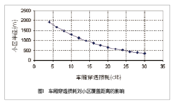 采用典型的電波傳播模型(如Ericsson9999模型),可以計(jì)算出小區(qū)半徑與穿透損耗的關(guān)系,如圖1所示??梢钥吹?,隨著車(chē)廂穿透損耗的增加,小區(qū)覆蓋半徑將會(huì)明顯縮小。從中我們可以得到結(jié)論,車(chē)廂穿透損耗是影響TD-SCDMA信號(hào)在火車(chē)車(chē)廂內(nèi)覆蓋的重要因素,在進(jìn)行無(wú)線(xiàn)網(wǎng)絡(luò)設(shè)計(jì)和優(yōu)化時(shí),必須仔細(xì)考慮穿透損耗的取值以及對(duì)網(wǎng)絡(luò)性能帶來(lái)的影響。
