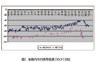 在廣州到深圳的高速鐵路的一段,緊鄰鐵路邊上有一條公路,這為我們測(cè)試創(chuàng)造了良好的條件。首先,我們運(yùn)用TD-SCDMAScanner測(cè)試動(dòng)車(chē)組內(nèi)的PCCPCH信號(hào)強(qiáng)度;然后,又在和鐵路線(xiàn)平行并緊靠鐵路的公路上測(cè)量相同小區(qū)的PCCPCH信號(hào)強(qiáng)度,運(yùn)用GPS記錄下測(cè)試信號(hào)點(diǎn)對(duì)應(yīng)的位置,從而記錄下測(cè)試的軌跡。通過(guò)對(duì)比車(chē)廂內(nèi)外得到的信號(hào)對(duì)比,我們便能得到火車(chē)的穿透損耗。典型的信號(hào)測(cè)試對(duì)比如圖2所示。