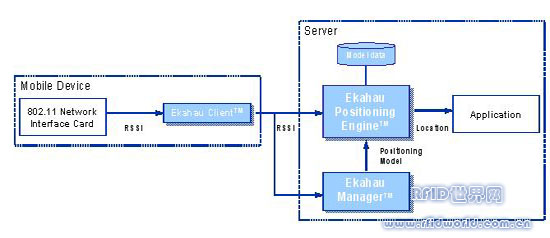 工作原理:無線信號強(qiáng)度(RSSI)方式。設(shè)備附近無線信號被記錄下來,Ekahau定位引擎里有無線信號的設(shè)置原型,定位引擎識(shí)別RSSI的值,并計(jì)算出地圖中二維坐標(biāo),客戶程序發(fā)送RSSI到定位引擎,定位引擎計(jì)算客戶程序并發(fā)送定位信息給應(yīng)用程序。