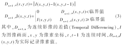 (2)連續(xù)圖像相減法,是指利用連續(xù)畫面直接作差異絕對(duì)值計(jì)算,用以尋找移動(dòng)物的位置,將2個(gè)畫面相減后,2個(gè)物體將會(huì)出現(xiàn)在不同位置,所以就能較明顯地觀察到該物體運(yùn)動(dòng)方向的位移量。該方法受環(huán)境噪聲的影響較小,但卻無法獲得完整的目標(biāo)物的形狀,因此也就無法準(zhǔn)確對(duì)目標(biāo)物進(jìn)行辨識(shí)與跟蹤。與背景相減法一樣,該方法也需要設(shè)置一個(gè)臨界值,若差值小于臨界值,則此像素不屬于運(yùn)動(dòng)目標(biāo),將之標(biāo)示為0,反之則是運(yùn)動(dòng)目標(biāo)的像素。