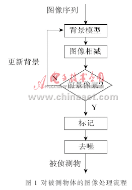 首先,要先建立起不含移動(dòng)物體的背景模型,該模型是由一連串輸入的圖像序列所組成[4]。建立過程中要盡量避免天氣變化、感測(cè)元件熱噪聲干擾、日光燈閃爍造成的光源變化等。該方法只需要少量的計(jì)算就能取得運(yùn)動(dòng)目標(biāo)的位置,并經(jīng)過后期的一些如腐蝕、膨脹法處理去除一定的噪聲,從而克服背景相減法不能取得完整正確圖像的缺陷。其過程如圖1所示。