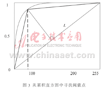 為了在累積直方圖中找到所要得到的閾值點(diǎn),選定離累積直方圖兩端點(diǎn)所組成直線最遠(yuǎn)距離的點(diǎn)作為要求的閾值點(diǎn),如圖3所示。