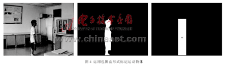 在檢測(cè)到運(yùn)動(dòng)目標(biāo)后,在實(shí)際運(yùn)用中往往需要對(duì)其進(jìn)行追蹤并記錄其運(yùn)動(dòng)軌跡。目前運(yùn)用的追蹤法主要分為四種:輪廓追蹤、特征追蹤、區(qū)域追蹤和模型追蹤[5]。輪廓追蹤是將檢測(cè)到的圖像變化區(qū)域用輪廓線來表示;特征追蹤是以物體特征為依據(jù)的追蹤方式,將檢測(cè)到的運(yùn)動(dòng)物體做特征分類,用以比對(duì)連續(xù)圖像間的特征來追蹤目標(biāo);區(qū)域追蹤是將先前檢測(cè)到的圖像變化的區(qū)域當(dāng)作運(yùn)動(dòng)目標(biāo),利用檢測(cè)到的這些變化區(qū)域位置,達(dá)到追蹤的目的;模型追蹤需要事先建立物體的模型,再利用運(yùn)動(dòng)特征建立運(yùn)動(dòng)模型,然后用運(yùn)動(dòng)模型去預(yù)測(cè)下一個(gè)物體運(yùn)動(dòng)的變化,再透過搜尋與比對(duì)來完成追蹤。本文用包圍盒的形式找到運(yùn)動(dòng)物體的中心點(diǎn)及它的范圍,求出中心點(diǎn)位置的好處在于能用一個(gè)點(diǎn)來代表運(yùn)動(dòng)物體,隨后在追蹤時(shí)會(huì)比較方便,如圖4所示。