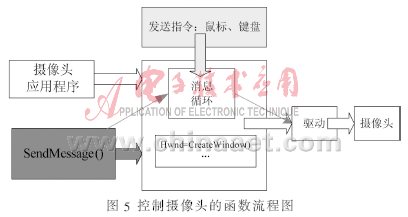 固定式攝像頭視野范圍相對(duì)狹小,跟蹤范圍也受到了極大限制?;诖?,有必要實(shí)現(xiàn)攝像頭的旋轉(zhuǎn)控制功能。實(shí)驗(yàn)中采用了羅技QuickCam攝像頭,操作系統(tǒng)是Windows XP。為了實(shí)現(xiàn)遠(yuǎn)程控制攝像頭旋轉(zhuǎn)的功能,需要用到Windows的SendMessage()函數(shù)命令,該函數(shù)將指定的消息發(fā)送到一個(gè)或多個(gè)窗口。其函數(shù)關(guān)系流程圖如圖5所示。