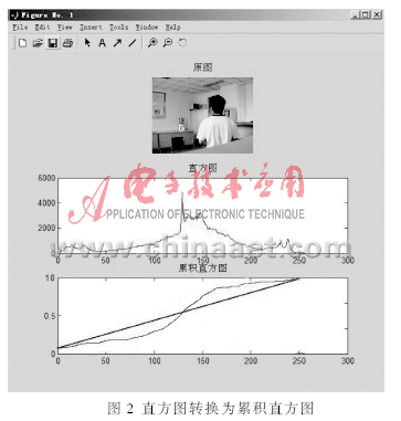 在連續(xù)的圖像幀中,由于光線的變化難免會(huì)使圖像夾雜著一定量的噪聲點(diǎn),因此,必須設(shè)定一個(gè)恰當(dāng)?shù)拈撝祵⒈尘芭c前景物標(biāo)記為0和1。閾值取得過大或過小都會(huì)影響前景物像素的精度。為了得到一個(gè)恰當(dāng)?shù)拈撝担疚倪\(yùn)用直方圖的理論來實(shí)現(xiàn)。在直方圖曲線中,直觀地表示了每一個(gè)灰度級(jí)與其出現(xiàn)的頻率關(guān)系。一旦曲線出現(xiàn)多個(gè)波峰與波谷,就需要使用累積直方圖來幫助尋找到這個(gè)動(dòng)態(tài)變化點(diǎn)。所謂累積直方圖是指記錄的數(shù)據(jù)點(diǎn)所出現(xiàn)的概率,在這里是指0~255的亮度值中,每一個(gè)值所出現(xiàn)的概率分布情況,處理結(jié)果如圖2所示。累積直方圖相對(duì)于直方圖而言,不存在曲線的高低變化,這是因?yàn)槔鄯e直方圖中上一點(diǎn)會(huì)與下一點(diǎn)的值作累加的原因,下一點(diǎn)的值永遠(yuǎn)大于上一點(diǎn)。借助累積直方圖處理問題也就更直觀可靠了。