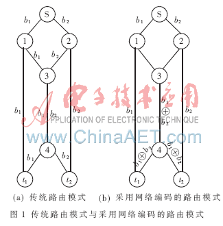 最初提出網(wǎng)絡(luò)編碼是用來解決網(wǎng)絡(luò)中組播的最大流問題,即給定一個通信網(wǎng)絡(luò),以G(V,E)來表示,G是一個有向無環(huán)圖。在組播通信中,需要一個信源S∈V和一組信宿T∈V。要實現(xiàn)組播通信,傳統(tǒng)的路由方式是建立一個或多個組播樹,即建立一棵以發(fā)送者為根節(jié)點、連接所有接收者的多播分發(fā)樹,所要傳輸?shù)男畔⒕驮谶@些事先選好的路徑上傳輸。所以建立組播樹是實現(xiàn)組播的關(guān)鍵,但是一般認(rèn)為組播樹的建立是一個NP問題。通常只是求出其近似解,先采用最大流算法找到信源S與一個信宿T1的最大流路徑,然后再依次尋找與下個信宿T2之間的最大流路徑,這時通常會在原通信網(wǎng)絡(luò)中去掉與T1之間已經(jīng)用過的鏈路的容量。這樣處理是因為傳統(tǒng)路由認(rèn)為網(wǎng)絡(luò)中傳輸?shù)男畔⑹遣荒墀B加的,只能存儲轉(zhuǎn)發(fā)。這樣的組播樹的建立方式就會導(dǎo)致信源S與信宿T2后面的信宿建立的路徑都不是以它們之間的最大流進(jìn)行傳輸?shù)摹6W(wǎng)絡(luò)編碼的提出就是為了解決這個問題,以實現(xiàn)由最大流最小割定理給定的一個通信網(wǎng)絡(luò)的容量上限。為了進(jìn)一步說明網(wǎng)絡(luò)編碼的原理,下面給出一個經(jīng)典的例子。如圖1所示,在這個蝶式網(wǎng)絡(luò)中,每個邊代表一個直接鏈路,每次可以可靠地傳輸一個包。源端S有2個包b1和b2,想要都發(fā)送給t1和t2。在如圖1(a)所示的傳統(tǒng)路由模式中,中間節(jié)點只能對接收到的數(shù)據(jù)包復(fù)制和轉(zhuǎn)發(fā),即3到4的鏈路每次只能傳輸b1或者b2,這條鏈路不得不使用2次才能達(dá)到目的,節(jié)點t1和t2最后一共收到3個包,平均速率為1.5個包/單位時間;圖1(b)中采用了網(wǎng)絡(luò)編碼,節(jié)點3對數(shù)據(jù)報進(jìn)行了異或處理,將處理后的數(shù)據(jù)包轉(zhuǎn)發(fā)出去,這樣一次傳輸就可以將b1⊕b2傳到節(jié)點4,由于t1和t2已經(jīng)接收到了b1和b2,所以再次進(jìn)行異或操作便可以得到b2和b1。這樣所能達(dá)到的平均速率為2個包/單位時間。從這個例子可以清楚地看到,網(wǎng)絡(luò)編碼能夠提高網(wǎng)絡(luò)吞吐量,保證負(fù)載均衡,減少傳輸次數(shù),縮短網(wǎng)絡(luò)延時。