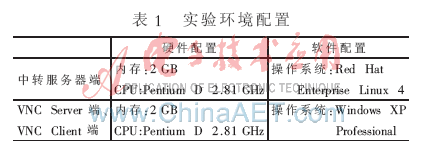 此改進(jìn)方案已經(jīng)應(yīng)用于VcomOffice遠(yuǎn)程視頻會議系統(tǒng)中。實(shí)驗(yàn)環(huán)境為:局域網(wǎng)內(nèi),中轉(zhuǎn)服務(wù)器采用Linux操作系統(tǒng),VNC Server和VNC Client端均采用Windows XP操作系統(tǒng),具體的軟硬件配置如表1所示。