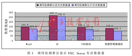 調(diào)用檢測算法前后VNC Server發(fā)送數(shù)據(jù)量如圖3所示。通過對比可以看到,在調(diào)用屏幕區(qū)域變化檢測算法前后,VNC Server端發(fā)送的數(shù)據(jù)量都會有一定程度的下降。當(dāng)執(zhí)行相同的Word操作時(shí),VNC Server端發(fā)送的數(shù)據(jù)量降低了12.21%,登錄新浪網(wǎng)主頁的過程中數(shù)據(jù)發(fā)送量只降低了4.82%,打開PDF文檔并拖動滾動條至最底端的過程中,發(fā)送的數(shù)據(jù)總量降低了14.63%,在資源管理器的縮放過程中,數(shù)據(jù)發(fā)送量下降了22.19%。