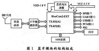V和1.8 V電壓,閃存用于存儲(chǔ)藍(lán)牙固件和配置參數(shù)。藍(lán)牙主機(jī)可通過各種接口(SPI,UART,USB等)實(shí)現(xiàn)與藍(lán)牙模塊的通信。
