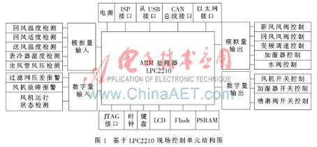 主處理器選用Philips公司生產(chǎn)的ARM7芯片LPC2210,該芯片是基于支持實(shí)時(shí)仿真和跟蹤的ARM7TDMI-S CPU的微控制器,最高工作頻率可達(dá)60 MHz,內(nèi)部帶有16 KB RAM,多達(dá)122個(gè)通用I/O口(可承受5 V電壓),具有兩個(gè)帶16 B收發(fā)FIFO的UART,兩個(gè)完全獨(dú)立的同步串行接口SPI等豐富的外設(shè)。本系統(tǒng)中,存儲模塊由擴(kuò)展的2 MB NOR Flash(SST39VF160)與8 MB PSRAM(MT45W4MW16)構(gòu)成,分別使用LPC2210外部存儲器接口的Bank0和Bank1地址空間;人機(jī)交互模塊包含鍵盤和LCD兩部分,顯示和設(shè)置空調(diào)機(jī)組的運(yùn)行參數(shù)及狀態(tài)??刂破髟O(shè)有8個(gè)按鍵輸入,使用I2C接口的接盤與LED驅(qū)動芯片ZLG7290進(jìn)行鍵盤掃描;從USB接口用于控制器與調(diào)試計(jì)算機(jī)的通信;控制平臺設(shè)計(jì)了以RTL8019AS芯片為核心的以太網(wǎng)接口電路,實(shí)現(xiàn)控制器與上位監(jiān)控級計(jì)算機(jī)之間的通信;CAN總線接口可用于現(xiàn)場設(shè)備的通信;ISP接口、JTAG口為程序下載調(diào)試接口;A/D模塊采用LPC2210自帶的8路10位ADC轉(zhuǎn)換器,檢測各路溫度及濕度模擬量的輸入,構(gòu)成反饋控制。D/A模塊的輸出信號作為比例放大器的輸入,控制各個(gè)調(diào)節(jié)閥門的開度大小,實(shí)現(xiàn)風(fēng)量和流量控制。數(shù)字量輸入通道檢測風(fēng)機(jī)的運(yùn)行狀態(tài)及過濾網(wǎng)壓差報(bào)警信號;數(shù)字量輸出通道輸出風(fēng)機(jī)、加濕器的開關(guān)控制信號??刂破魍ㄟ^對整個(gè)空調(diào)系統(tǒng)新風(fēng)、回風(fēng)的溫濕度、送風(fēng)風(fēng)機(jī)運(yùn)行狀態(tài)、初中效過濾段的壓差等信號的采集,控制送風(fēng)風(fēng)機(jī)的變頻調(diào)速、加濕器的加濕、新風(fēng)及回風(fēng)閥門的開度、冷熱水閥的開度大小,以達(dá)到設(shè)定的空氣狀態(tài)[4]。