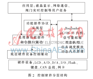 控制器軟件由3部分組成:實(shí)時(shí)操作系統(tǒng)、硬件驅(qū)動程序和運(yùn)行在操作系統(tǒng)之上的應(yīng)用程序[5]。實(shí)時(shí)操作系統(tǒng)采用源碼公開的μC/OS-II,基于其內(nèi)核擴(kuò)展的實(shí)時(shí)操作系統(tǒng)的整體結(jié)構(gòu)如圖2所示。
