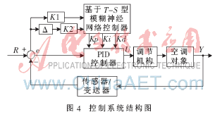 在機(jī)組控制任務(wù)Task_control()中需要對采集過來的各路模擬量及數(shù)字量信號進(jìn)行處理,以得到合適的輸出控制信號,選取何種處理方法直接關(guān)系到控制器的控制品質(zhì)。針對中央空調(diào)對象大慣性、大滯后、非線性等特性,常規(guī)PID控制無論在參數(shù)整定還是在控制精度或控制過程都存在不足[4,9]。本系統(tǒng)采用基于T-S模型的模糊神經(jīng)網(wǎng)絡(luò)[10]參數(shù)自整定PID控制方法,利用神經(jīng)網(wǎng)絡(luò)經(jīng)訓(xùn)練后可以逼近任意非線性關(guān)系特性,并綜合了PID控制與模糊控制各自的優(yōu)勢。圖4為控制系統(tǒng)結(jié)構(gòu)圖[9],模糊神經(jīng)網(wǎng)絡(luò)模塊根據(jù)誤差及其變換率實(shí)時(shí)地修改PID控制器的3個(gè)參數(shù),使其處于最優(yōu)狀態(tài)。圖5為基于T-S模型神經(jīng)網(wǎng)絡(luò)結(jié)構(gòu)圖[11]。