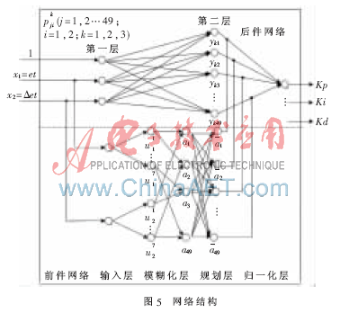 以溫控為例,網(wǎng)絡(luò)的輸入信號x1、x2分別是溫差及溫差變化率et、Δet,模糊論域分別定為[-20,20]、[-10,10],模糊子集均為:NB(負(fù)大)、NM(負(fù)中)、NS(負(fù)小)、ZE(零)、PS(正小)、PM(正中)、PB(正大),模糊規(guī)則49條,隸屬度函數(shù)為高斯函數(shù)。前件網(wǎng)絡(luò)輸入層直接將et、Δet送入到模糊化層計(jì)算其屬于各語言變量值模糊集合的隸屬度函數(shù),規(guī)則層采用求積法計(jì)算出每條規(guī)則的適用度[10]。后件網(wǎng)絡(luò)由3個(gè)結(jié)構(gòu)相同的并列子網(wǎng)絡(luò)組成,輸出PID控制器的3個(gè)控制參數(shù)kp、ki、kd。系統(tǒng)采集常規(guī)PID控制器工作時(shí)et、Δet輸入數(shù)據(jù)及控制參數(shù)為訓(xùn)練樣本,利用誤差反傳算法訓(xùn)練網(wǎng)絡(luò)參數(shù):連接權(quán)pkji、隸屬度函數(shù)中心值cij及寬度δij。試驗(yàn)記錄表明訓(xùn)練后的控制器的動態(tài)特性與靜態(tài)特性均優(yōu)于傳統(tǒng)PID及單純模糊控制方法。