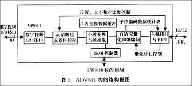℃。該芯片不僅集成了視頻編碼/解碼算法,還提供了數(shù)據(jù)壓縮效果的實(shí)時(shí)調(diào)節(jié)手段,數(shù)據(jù)輸出速率可以靈活控制。ADV611能實(shí)時(shí)地對(duì)包括PAL制式(720×288@50場(chǎng)/s)和NTSC制式(720×243@60場(chǎng)/s)在內(nèi)的視頻信號(hào)實(shí)時(shí)進(jìn)行壓縮和解壓縮。壓縮倍數(shù)從視覺(jué)無(wú)失真感的4∶1到7500∶1,