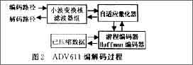  ADV611編碼時(shí)從它的數(shù)字視頻接口接收未壓縮的數(shù)字視頻信號(hào),經(jīng)小波變換和幀抽取、送入量化器進(jìn)行系數(shù)量化、再經(jīng)游程編碼和Huffman  編碼,產(chǎn)生壓縮后的數(shù)據(jù)流,送入集成于片內(nèi)的512×32位大小的FIFO緩存區(qū),一旦FIFO的數(shù)據(jù)量達(dá)到主機(jī)在寄存器里的預(yù)置值時(shí),ADV611就發(fā)出中斷請(qǐng)求信號(hào),從它與主處理器的接口輸出壓縮數(shù)據(jù)比特流。解碼過(guò)程與之相反,壓縮數(shù)據(jù)由主機(jī)送入FIFO,解碼后產(chǎn)生標(biāo)準(zhǔn)的視頻分量從數(shù)據(jù)視頻接口輸出。編解碼過(guò)程如圖2所示。