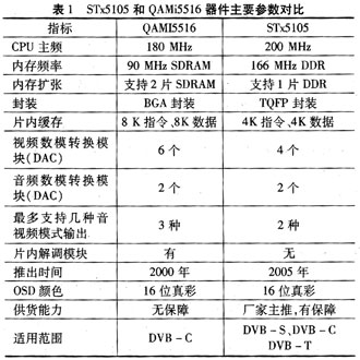 而STx5105是一款專(zhuān)門(mén)針對(duì)中低端市場(chǎng)的高性?xún)r(jià)比機(jī)頂盒器件,適用于數(shù)字衛(wèi)星電視(DVB-S)、數(shù)字有線(xiàn)電視(DVB-C)、數(shù)字地面電視(DVB-T)機(jī)頂盒,它無(wú)內(nèi)置QAM解調(diào)器。根據(jù)封裝工藝以及面向不同的應(yīng)用市場(chǎng),STi5105系列產(chǎn)品有STx5105、STM5105和STB5105三種型號(hào)產(chǎn)品,這三種型號(hào)產(chǎn)品的硬件性能規(guī)格和應(yīng)用相同。STx5105與QAMi5516器件主要參數(shù)如表1所示。