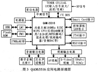 采用STx5105和QAMi5516設(shè)計(jì)的基于DVB-C機(jī)頂盒的應(yīng)用電路原理分別如圖2、圖3所示。