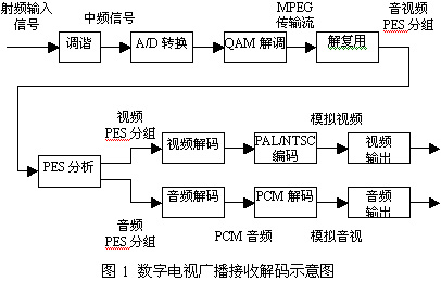 有線電視數(shù)字機(jī)頂盒的基本功能是接收數(shù)字電視廣播節(jié)目,示意圖如圖所示,調(diào)諧模塊接收射頻信號并下變頻為中頻信號,然后進(jìn)行A/D轉(zhuǎn)換變?yōu)閿?shù)字信號,再送入QAM解調(diào)模塊進(jìn)行QAM解調(diào),輸出MPEG傳輸流串行或并行數(shù)據(jù)。解復(fù)用模塊接收MPEG傳輸流,從中抽出一個節(jié)目的PES數(shù)據(jù),包括視頻PES、音頻PES以及數(shù)據(jù)PES。解復(fù)用模塊中包含一個解擾引擎,可在傳輸流層和PES層對加擾的數(shù)據(jù)進(jìn)行解擾,其輸出是已解擾的PES。視頻PES送入視頻解碼模塊,取出MPEG視頻數(shù)據(jù),并對MEPG視頻數(shù)據(jù)進(jìn)行解碼,然后輸出到PAL/NTSC編碼器,編碼成模擬電視信號,再經(jīng)視頻輸出電路輸出。音頻PES送入音頻解碼模塊,取出MPEG音頻數(shù)據(jù),并對MPEG音頻數(shù)據(jù)進(jìn)行解碼,輸出PCM音頻數(shù)據(jù)到PCM解碼器,PCM解碼器輸出立體聲模擬音頻信號,經(jīng)音頻輸出電路輸出。