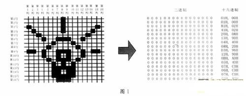 在點(diǎn)陣式液晶中顯示圖像,首先要獲得圖像的點(diǎn)陣值。最傳統(tǒng)、最簡(jiǎn)單直接的點(diǎn)陣獲取方法就是坐標(biāo)掃描法。其基本步驟為:將圖像置于坐標(biāo)系中,根據(jù)坐標(biāo)格上象素的存在與否決定該點(diǎn)值為1還是0;然后將每八個(gè)象素值拼成一個(gè)字節(jié),從而得到該圖像的點(diǎn)陣數(shù)據(jù)。圖1為一個(gè)燈泡圖像掃描成16×16點(diǎn)陣的示意。