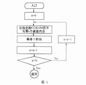 眾所周知,動(dòng)畫(huà)顯示的基本原理是利用人眼的視覺(jué)殘留,將一序列靜止的畫(huà)面按一定的時(shí)間間隔連續(xù)播放。可見(jiàn),只要獲得各靜態(tài)子畫(huà)面的點(diǎn)陣值,就可以實(shí)現(xiàn)在點(diǎn)陣式液晶中的動(dòng)畫(huà)顯示。圖4是實(shí)現(xiàn)一個(gè)包括N個(gè)子畫(huà)面的動(dòng)畫(huà)顯示流程。其中時(shí)間間隔T根據(jù)實(shí)際效果設(shè)置。
