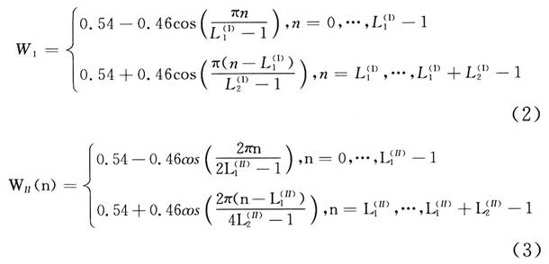 通過Hh1(z)濾波后的信號再除以2的信號設為S(n),在12.2 kb/s模式下,利用不同的非均勻窗,每幀執(zhí)行2次LP分析。第1個窗集中在第2個子幀,第2個窗的中心在第4個子幀,這2個窗口如下所示: