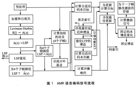 AMR語音編碼根據(jù)其實現(xiàn)的功能可分為LPC分析、基音搜索、代數(shù)碼本搜索三部分。其中LPC分析完成的主要功能是獲得10階LPC濾波器的10個系數(shù),并對轉(zhuǎn)化成的線譜參數(shù)LSF進行量化;基音搜索用以獲得基音延遲和基音增益這兩個參數(shù);代數(shù)碼本搜索則是為了獲得索引和代數(shù)碼本增益及碼本增益的量化。 AMR編碼器的信號流程如圖1所示。